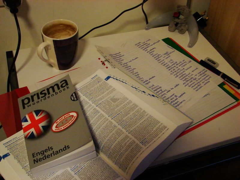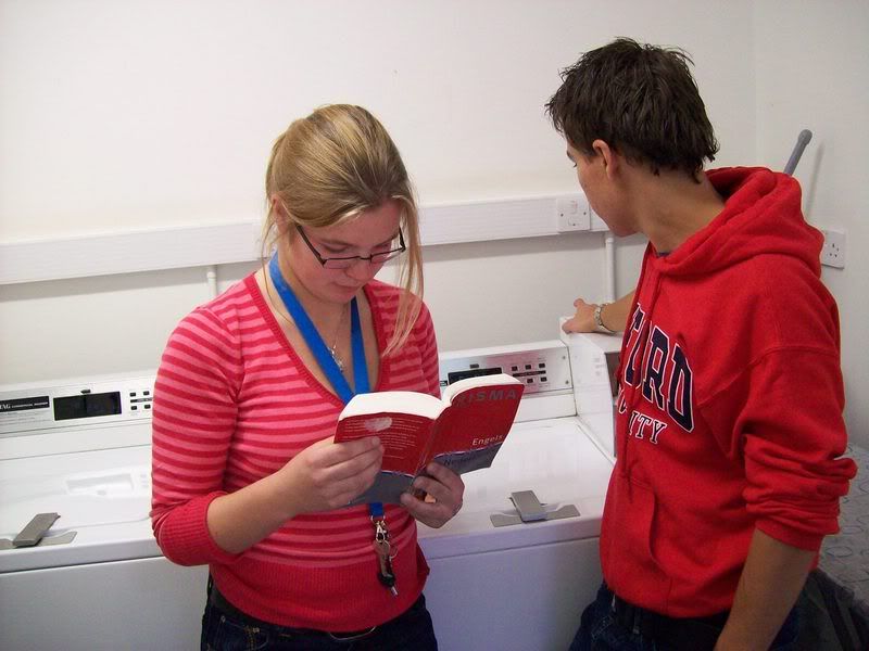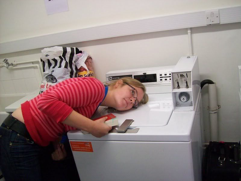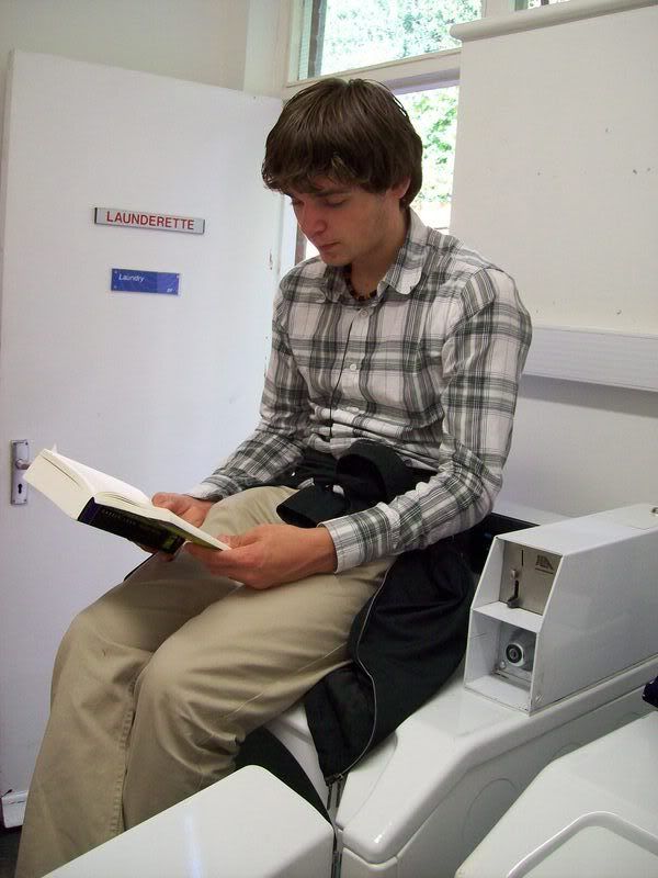 Als de was dan uiteindelijk opgestart is - "Twee pond voor een half uur, wat een afzetters!" - besluiten we uit voorzorg maar een vinger aan de pols te houden. Boekje erbij en wachten tot het leed geleden is.Ongeveer een half uur en vele angstige momenten later kan het deurtje van de magic box dan uiteindelijk weer open. De jongens besluiten hun kleding ook nog in de droger te duwen, maar ik durf dat niet aan: ik kan het me niet veroorloven een spijkerbroek te laten krimpen, met al dat Engelse eten. Terwijl zij hun sokken bij elkaar graaien probeer ik mijn spullen er tussenuit te vissen en maak ik me uit de voeten naar mijn kamer.