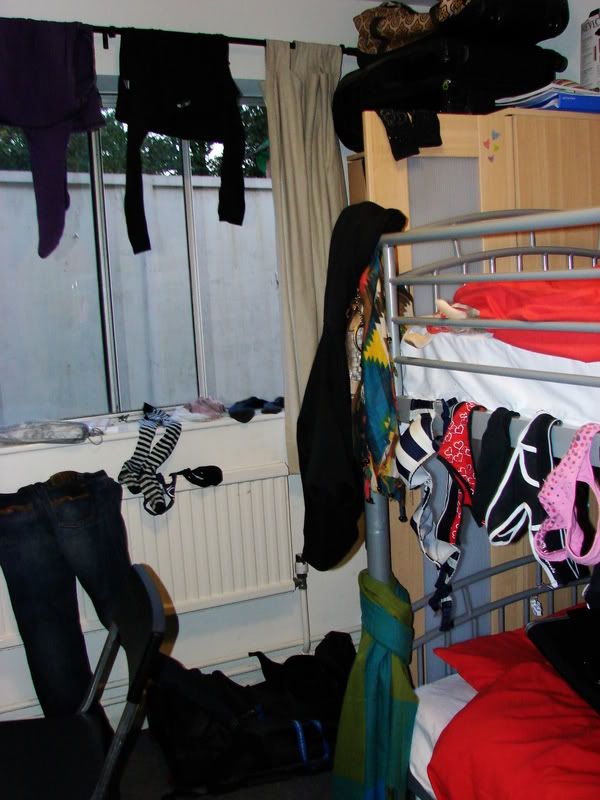 Mijn roommate droogt haar spullen ook altijd over de verwarming, dus ik kan dat ook, redeneer ik. Helaas heb ik toch wat meer nattigheid mee dan ik dacht en al snel is de hele kamer veranderd in een drooghok. Als alles hangt, inclusief een paar eenzame en een paar onbekende sokken, kan de verwarming op zes. Lang leve de sauna.